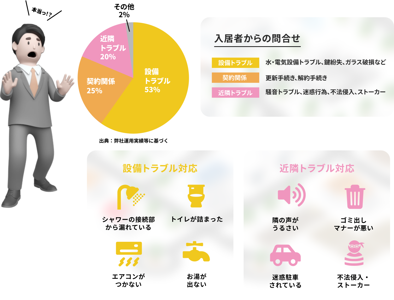 管理業務といえば「入居者トラブル・設備トラブルへの迅速な対応」「入出金管理」「建物の維持保全」などたくさんの細かな面倒な業務が多い、そんなイメージをお持ちではないでしょうか。